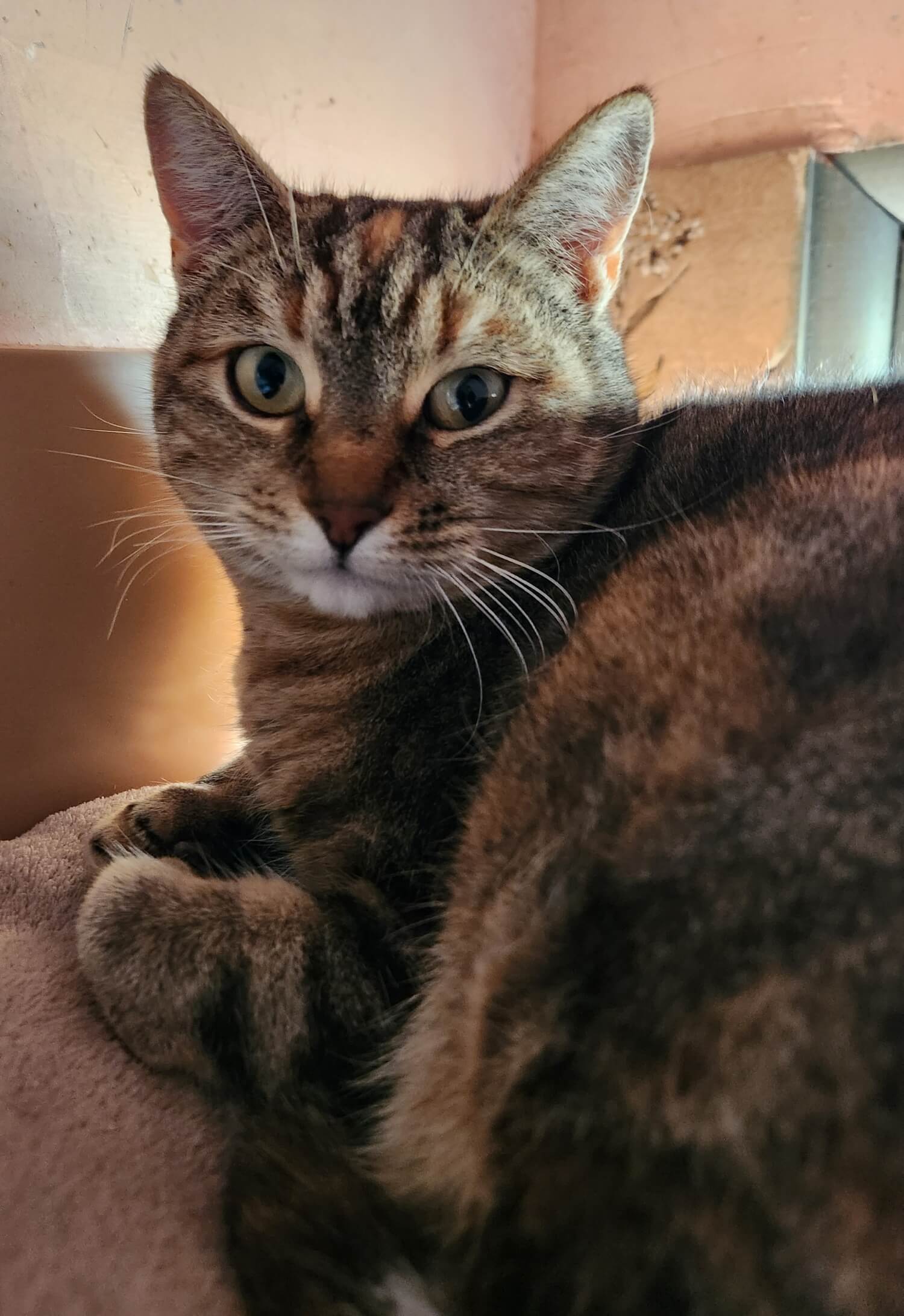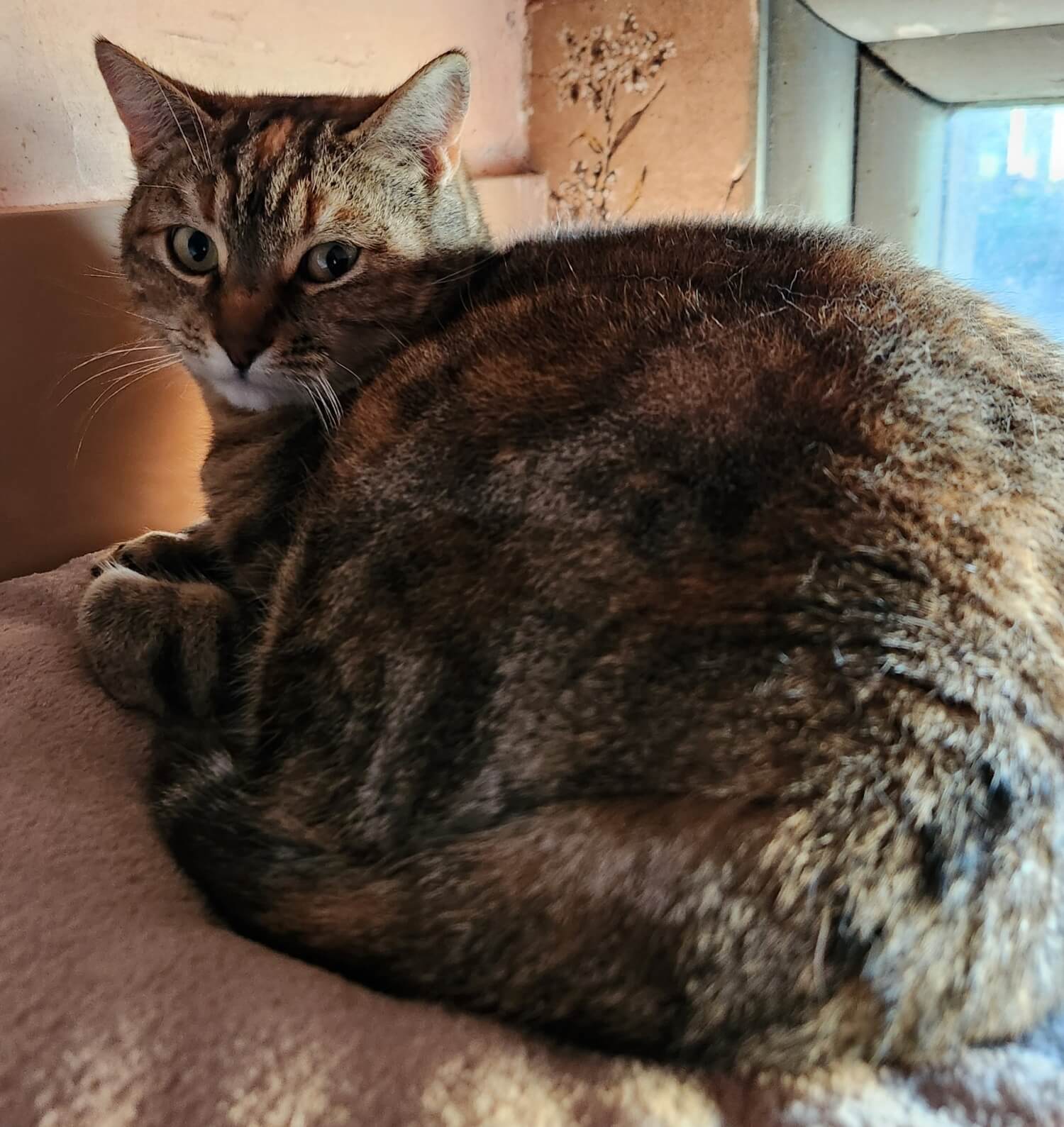 Femelle estimée née en janvier 2021.Catherine est arrivée en juillet 2025 avec ses cinq chatons, dans le cadre de la fourrière.